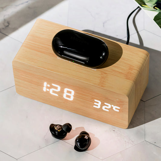 TIN-IN - Digitale Bureauklok - Temperatuurmeter met Draadloze oplader - licht hout